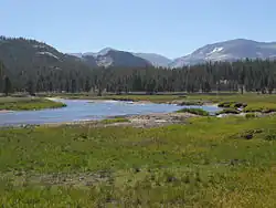 The Tuolumne River watershed can be divided into three distinct physiographic regions. From the headwaters to below Hetch Hetchy Reservoir, the river drains the Sierra highlands, which are characterized by solid, glacier-carved granitic bedrock, thin poor soils and areas of heavy forestation. Most of the snowpack that feeds the Tuolumne accumulates in this region.[21] Streams are generally high-gradient, clear and rocky, but large alpine meadows provide riparian and wetland habitat, which contribute sediment to the watershed's runoff. There are also a large number of natural lakes and tarns in the upper watershed. The Sierra crest harbors a number of glaciers, including Lyell and Maclure Glaciers, the largest in Yosemite National Park. Melting ice feeds the upper reaches of the Tuolumne River, maintaining water flow in the late summer when many other streams in the region are dry.[22] The Lyell Glacier is the second largest in the Sierra Nevada, after Palisade Glacier at the headwaters of Big Pine Creek a tributary of the Owens River.[23] Both Lyell and Maclure glaciers have shrunk significantly since the late 1800s when measurements were first made.[24]