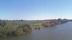 Leaving the foothills, the Tuolumne flows approximately 50 miles (80 km) west across the Central Valley to its confluence with the San Joaquin River, passing Waterford, Hughson, Empire, Ceres and Modesto. The lower Tuolumne is wide and slow-flowing, dropping just 230 feet (70 m) from the base of La Grange Dam to its mouth at 26 feet (7.9 m).[16] Highway 99 and the Southern Pacific Railroad tracks both cross the river in Modesto, and the Modesto Airport is located adjacent to the river shortly upstream. Dry Creek joins the Tuolumne from the north between the airport and the railroad. The confluence of the Tuolumne and San Joaquin is located in the San Joaquin River National Wildlife Refuge, about 2 miles (3.2 km) north of Grayson in Stanislaus County.[17]