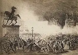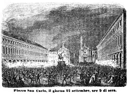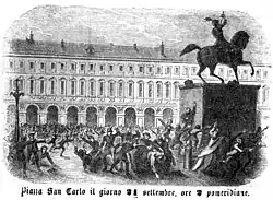 In the evening, several gatherings formed around the city which insulted the carabinieri and public security officers present in the streets and reached Piazza San Carlo.[29] In the square, defending the police headquarters, were the carabinieri, infantry and public security officers, but without coordination between the different corporations. The square was crowded, however, and carriages passed regularly. The presence of the carabinieri was the cause of insults, as they were accused of firing on helpless citizens the day before; the commanders' proposal to withdraw the carabinieri from the square to avoid incidents was not approved by the police commissioner.[30]