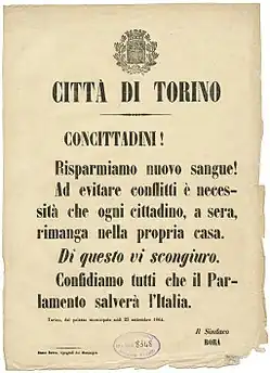 - ^ "Commissione d'inchiesta sui fatti avvenuti in Torino il 21 e 22 settembre 1864". Archived from the original on August 13, 2017.