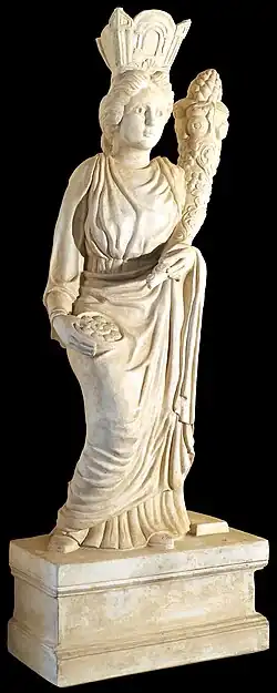 In light of the statue's urban context,[27] Pascal Vipard proposes that it may be identified with Fortuna Tyché, Genius Loci, or Tutela.[10] According to Pascal Vipard,[10] the statue, which features a tower and a cornucopia, would be an urban representation of Fortuna and should be named Aregenua. The local genius personified urban settlements.[27]