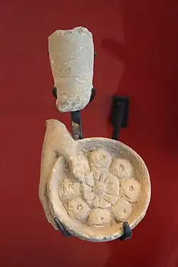 The figurine was unearthed at the archaeological site of Vieux-la-Romaine, 10 km southwest of Caen,[1] in a 1st-century structure destroyed by fire in the 3rd century.[2] This structure is known as "le bas de Vieux."[1]