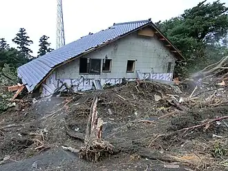 Typhoon Wipha weakened as it skirted Japan's eastern coastline on October 15. Though the storm caused only limited damage on the mainland, it spawned a massive landslide on the island of Izu Ōshima, killing at least 31 and leaving 13 others missing.[11] In addition, a woman was killed in western Tokyo, and the body of one of two schoolchildren who went missing near Kanagawa was later found. A man in Chiba and the other child were still reported missing, in addition to the victims on Oshima.[12][13] At least 350 homes were destroyed throughout Japan, mostly on Izu Ōshima.[14]