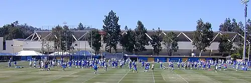 The first football team fielded by UCLA took the field in 1919.[5] The team was coached by Fred Cozens, and compiled a 2–6 record.[5] UCLA did not participate in an athletic conference until 1920, so the 1919 football team played a schedule full of local high schools and other assorted teams.[5] Cozens was UCLA's athletics director from 1919 to 1942.[6] Harry Trotter took over the young UCLA football program after Cozens stepped down after guiding the Bruins in their first season.[7] UCLA began to play in the Southern California Intercollegiate Athletic Conference (SCIAC) in 1920, and competed against Occidental College, California Institute of Technology, University of Redlands, Whittier College, and Pomona College.[7] Coach Trotter's two wins were against Redlands and San Diego State, which did not join the SCIAC until 1926.[7] Trotter left UCLA with a 2–13–1 record in three seasons (1920–1922).[7] James J. Cline took over the Bruins football program as its third head coach in 1923.[7] Coach Cline's two wins were against Loyola University and San Diego State.[7] Cline was replaced after two seasons and a 2–10–3 record.[7]