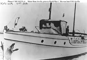 Arvilla was built as a private motorboat of the same name by Joe Fellows at Wilmington, Delaware. In 1917, the U.S. Navy acquired her under a free lease from her owner, Harry Fisher of San Diego, California, for use as a section patrol boat during World War I. She was commissioned on 5 May 1917 as USS Arvilla (SP-752), although the Navy did not actually take possession of her from Fisher until 24 June 1917.