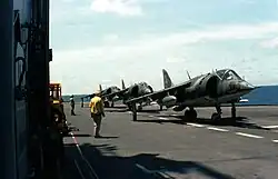 AV-8A Harriers of VMA-513 line up for launching from Belleau Wood in May 1982