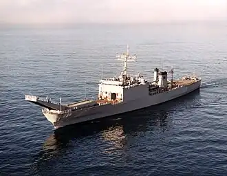 The Newport class were larger and faster than previous LSTs and were able to transport tanks, heavy vehicles and engineer groups and supplies that were too large for helicopters or smaller landing craft to carry.[6] The LSTs have a ramp forward of the superstructure that connects the lower tank deck with the main deck and a passage large enough to allow access to the parking area amidships. The vessels are also equipped with a stern gate to allow the unloading of amphibious vehicles directly into the water or to unload onto a utility landing craft (LCU) or pier. At either end of the tank deck there is a 30 ft (9.1 m) turntable that permits vehicles to turn around without having to reverse.[1][2] The Newport class has the capacity for 500 long tons (510 t) of vehicles, 19,000 sq ft (1,800 m2) of cargo area and could carry up to 431 troops.[1][7] The vessels also have davits for four vehicle and personnel landing craft (LCVPs) and could carry four pontoon causeway sections along the sides of the hull.[2][3]
