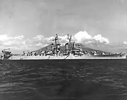 Two weeks later, on 1 July, the fleet sortied to carry out a series of air strikes on Japanese targets in the Home Islands. Dayton formed part of the anti-aircraft screen that protected the aircraft carriers during these operations. The attacks began on 7 July and were carried out intermittently over the following eleven days. During this period, on 18 July, Dayton was temporarily transferred to Task Group 35.4, along with the cruisers Topeka, Atlanta, and Duluth and eight destroyers. The unit carried out a sweep for Japanese coastal shipping that night, but failed to locate any significant targets.[4][6] Dayton thereafter returned to TG 38.1 and remained with it for the next month during the initial occupation operations. The ships entered Sagami Bay on 27 August with the rest of TF 38 to begin preparations for the formal surrender of Japan, which took place aboard the battleship Missouri on 2 September.[7] Dayton entered Tokyo Bay on 10 September as part of the occupation force. She remained there through 7 November, apart from a brief voyage to Eniwetok for periodic maintenance. Dayton left Japan on 7 November and reached San Pedro, California, twelve days later. The ship received one battle star during her short wartime career.[4]