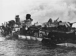 The next week brought constant enemy air raids and a succession of far reaching fleet moves as the Imperial Navy made one final but futile effort to drive America out of the Philippines and regain some measure of control over the seas. In this struggle, known to history as the Battle of Leyte Gulf, the Japanese Navy was all but annihilated. Three enemy battleships, four carriers, six heavy cruisers, four light cruisers, nine destroyers, and a host of planes were destroyed. Hazelwood herself accounted for at least two kamikazes destroyed.