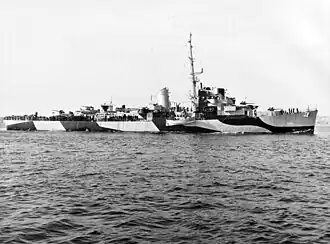 During September, she escorted landing craft of the U.S. 5th Fleet's amphibious force from Saipan to Nagasaki; then, in October, screened transports from Luzon to Sasebo. On 18 October, she departed Japan for the United States.