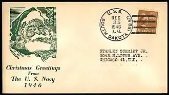 The ship remained in the Navy's inventory for another fifteen years before being stricken from the Naval Vessel Register on 1 June 1962. South Dakota was sold to the Lipsett Division of Luria Brothers and Co. to be broken up for scrap on 25 October. Tugboats towed her from Philadelphia in November to Kearny, New Jersey to be dismantled. Some parts of the ship were retained through the efforts of the Sioux Falls Chamber of Commerce, and they were installed in a memorial to the ship in the city on 7 September 1969.[38] The memorial consists of a low concrete wall built in the outline of the ship in full scale, and artifacts from the ship, including an anchor, a simulated gun turret, and a 16-inch gun are displayed in the outline. A museum was erected in the center of the outline, and it displays other artifacts, including her bell, sailors' uniforms, a scale model of South Dakota, and various other displays.[40] Additional artifacts from the ship are preserved at the National Museum of the United States Navy, including one of South Dakota's screws and a section of armor plate. Both items are on display in Willard Park.[41]