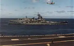 Returning to the combat zone on 17 December, Wisconsin embarked United States Senator Homer Ferguson of Michigan on 18 December. That day, the battleship supported the 11th ROK invasion with night illumination fire that enabled the ROK troops to repulse a North Korean assault with heavy enemy casualties.[15][17] Departing the "bombline" on 19 December, the battleship transferred Ferguson by helicopter to the carrier Valley Forge.[15]