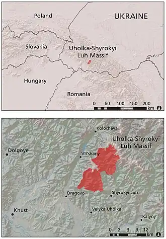 The protected forest area, Uholka-Shyrokyi Luh, is located in the Trancarpathian region of Ukraine and belongs to the Carpathian Biosphere Reserve. It is the largest primeval beech forest worldwide with an area of 8800 ha.[1] Since 1920, some parts of this forest have been protected. In 1992, Uholka-Shyrokyi Luh primeval beech forest was designated as UNESCO World Heritage Site. Later, several other primeval and old-growth beech forests in Europe were included (in 2007 and 2011) in the UNESCO World Heritage Site Ancient and Primeval Beech Forests of the Carpathians and Other Regions of Europe[2] as well.