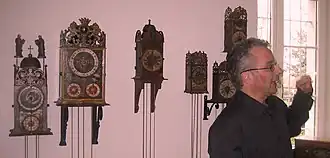 The collection focusses on clocks although there are a few watches as well. It is particularly rich in rustic clocks of Switzerland, mostly with wooden movements, and forged iron clocks of the Gothic period. There is a good collection of Renaissance timepieces and of Neuchatel type pendules as well. Altogether several hundred clocks are displayed.
