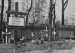 Approximately 600 deceased patients were buried under the hospital's wall, facing Ujazdów Park, in a temporary Warsaw Defenders' Cemetery. The remains were exhumed in 1950 and reburied at Powązki Military Cemetery.[3]