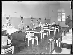 After the capitulation of Warsaw on 28 September 1939, the hospital continued medical operations under strained conditions. In 1941, parts of the bombed Hospital of the Holy Spirit were relocated there.[8] Beyond core medical duties, the hospital maintained ties with the Polish Underground State. In the so-called "Ujzdów Republic", it organised medical training for doctors and nurses and conducted research. Edward Loth, a University of Warsaw professor, established a Disabled Retraining Institute on 1 January 1941 and a modern rehabilitation facility, unique among occupied countries.[9] The hospital issued false disability certificates for hiding soldiers,[10] aided Jews and others pursued by the Gestapo,[3] and supported Soviet prisoners of war[9][11] held in a separate guarded pavilion without basic care.[9]