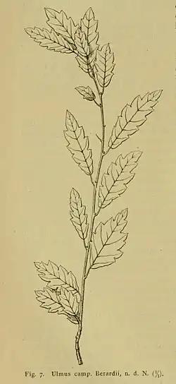 The elm cultivar Ulmus 'Berardii', Berard's Elm, was raised in 1865, as Ulmus Berardi, from seeds collected from large specimens of "common elm" growing on the ramparts at Metz, by an employee of the Simon-Louis nursery named Bérard.[1][2][3] Élie-Abel Carrière, the Späth nursery of Berlin, and the Van Houtte nursery of Gentbrugge regarded it as form of a Field Elm, listing it as U. campestris Berardii,[2][4][5][6] the name used by Augustine Henry.[3] Cheal's nursery of Crawley distributed it as Ulmus nitens [:Ulmus minor] 'Berardii'.[7] Smith's of Worcester preferred the original, non-specific name, Ulmus 'Berardii'.[8]