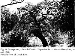 The journal Nature reported in July 1918 "a remarkable elm of the variety known as Ulmus serpentina, apparently about sixty years old, vigorously growing in a Croydon garden".[22] "Sixty years old" would pre-date the first known reference to a 'Serpentina', but would tally with an early 'Camperdownii' planting. Späth's U. montana serpentina was planted at Kew in 1896. Henry, though he describes Kew's 'Serpentina', calling it "U. major var. serpentina Henry", makes, unusually, no mention of a Kew 'Camperdownii'. Späth's U. montana serpentina was planted in 1897 at the Dominion Arboretum, Ottawa, Canada, which, though it contained some eighty elm cultivars by the turn of the century, had no specimen labelled 'Camperdownii'.[24] Three specimens supplied by the Späth nursery to the Royal Botanic Garden Edinburgh in 1902 as U. montana serpentina[25] are now assumed by the Garden to have been 'Camperdownii',[26] the Garden having no separate accession record for its 'Camperdownii', a sizeable tree by the 1970s (felled in the 1980s).[27] A specimen of U. montana serpentina obtained from Späth before 1914, and planted in 1916, stood in the Ryston Hall arboretum, Norfolk,[28] in the early 20th century.[29] A 1920 photograph taken at Hortus Botanicus, Leiden, showing a weeping tree, is captioned Ulmus scabra [: U. glabra Huds.] Serpentina.[30] Its identification by the arboretum as a wych cultivar points to Camperdown Elm.[31]