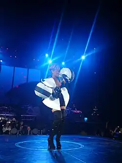 "Umbrella" was performed by Rihanna during the 2007 MTV Movie Awards on June 3, 2007.[105] In the United Kingdom, she performed the song on the ITV morning show GMTV and at the Brit Awards (alongside Klaxons) in 2008. She also performed "Umbrella" during her AOL sessions.[106] In France, she performed it on Star Academy.[107] "Umbrella" was added to the setlist of her first headlining Good Girl Gone Bad Tour where it was performed as the final song for the encore. It was also included as the closing act of the Last Girl on Earth tour and the Loud Tour. Rihanna performed "Umbrella" at Radio 1's Hackney Weekend on May 24, 2012, as the sixteenth song on the set list.[108] The performance featured a giant sphinx on the stage.[109] The song was also performed during the Diamonds World Tour and the Anti World Tour. On February 12, 2023, she performed the song as part of her set during the halftime show of Super Bowl LVII.[110]