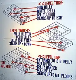 The venue now includes a number of different performance spaces, with themed names such as Iron Belly, White Belly and Big Belly. The Belly Laugh (originally the Belly Bar) was also used for late night cabaret as well as the venue's second bar. Space downstairs which is now used for Belly Dance was used to exhibit a film installation by Nick Hornby.