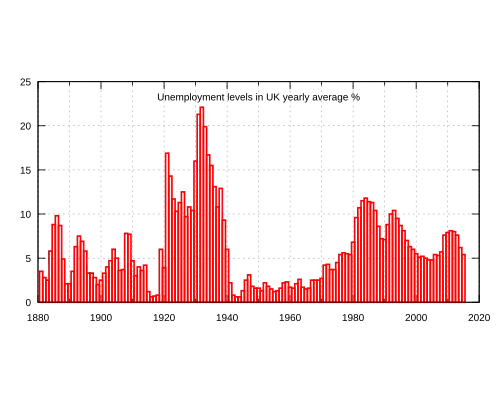 Data available from 1881 to 1912 is based on the records of trade unions that paid unemployment benefit to their members. In 1912 there were 1.4 million members of trade unions that paid benefits. This means the unemployment rates for this period are based on a very small section of the UK population at the time (mainly manual workers). The lowest unemployment rate recorded in this period was 1.4% in 1890 and the highest was 10.2% in 1892.[19]
