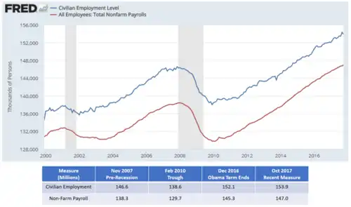 - Civilian employment, one measure of the size of the employed workforce, expanded consistently during the 1990s, but was inconsistent during the 2000s due to recessions in 2001 and 2008–2009. From 2010 onward, it steadily rose through October 2017.[45] For example, employment did not recover its January 2001 peak of 137.8 million until June 2003. Then, from the bubble-assisted peak in November 2007 of 146.6 million, 8.6 million jobs were lost due to the global economic crisis, with employment falling to 138.0 million. U.S. employment began rising thereafter and regained the pre-crisis peak by September 2014. By December 2016, civilian employment was 152.1 million, 5.5 million above the pre-crisis level and 14.1 million above the trough. By October 2017, 153.9 million were employed.[46]