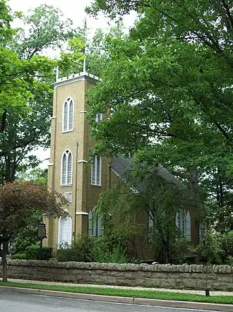 In 1842, the building was extensively rebuilt as a Gothic-style, Anglican church with a three-story entrance tower added to the front, a chancel added to the rear and the log walls of the meetinghouse incorporated into the main sanctuary. A rough mixture of plaster and clay stucco covers the church giving it its common name of the "Old Mud Church."[3]