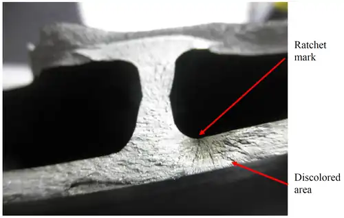 Fan blade No. 11 was fractured transversely across the airfoil directly above the fairings that are between the base of each blade. The blade's fracture surface was flat with elliptical-shaped marks across the internal ribs and along the convex surface of the airfoil. The other fan blade, which was identified as fan blade No. 10 and was the adjacent trailing blade, was fractured across the airfoil about 24 inches (61 cm) above the fairings. Laboratory examination of fan blade No. 11 revealed a low cycle fatigue (LCF) fracture that originated on the interior cavity wall directly below the surface.[3]