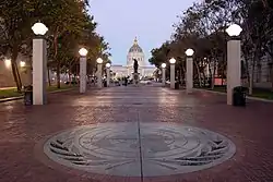 When Civic Center was nominated for inclusion on the National Register of Historic Places (NRHP), UN Plaza was noted for providing "a pedestrian approach to the Civic Center and a clear view from Market Street to City Hall."[53] UN Plaza is eligible on its own design merits for inclusion on the NRHP, and San Francisco also considers it eligible for inclusion on the California Register of Historic Resources for its original design merits, in addition to its historic role in the LGBTQ movement as the site of parades and protests.[54]