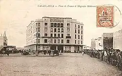 The Magasins Paris-Maroc building (1914), constructed by Hippolyte Delaporte and Auguste Perret, was located at the southern end of Place de France.[1][2] in 1915, Hubert Lyautey inaugurated the new Casablanca branch of the State Bank of Morocco was inaugurated on the square's northeastern side.[3][4] The Neo-Mauresque Hotel Excelsior, which remains today, was built in 1916.[5]