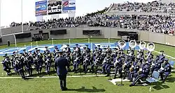 The United States Air Force Academy Band is a United States military band based out of Peterson Space Force Base near Colorado Springs, Colorado.[1] Despite the fact that it provides musical support to the USAFA Cadet Wing, it is an active duty full time band.[3] The USAFA Drum and Bugle Corps is composed of cadets of the academy, similar to a college marching band. The USAFA Band uses the power of music to honor our nation's flag, leaders and veterans; inspire Airmen and Guardians and the next generation to serve; and connect the Department of the Air Force to the American public and audiences around the world in direct support of the warfighter while developing leaders of character. It is one of two premier ensembles in the Air Force, with the other being the United States Air Force Band. The band was established a Lowry Field in 1955, shortly after the foundation of the academy.[4][5][6]