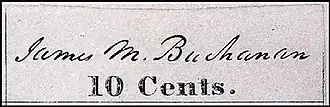 • Baltimore (twelve subjects: nine 5¢ stamps, three 10¢ stamps) (Note: Baltimore also employed three handstamps of the "James M. Buchanan" signature to imprint indicia on envelopes. The signature is not that of the future president, but of his cousin: James Madison Buchanan, the Postmaster of Baltimore.)