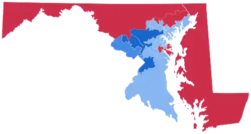 Bush did win most of the counties in Maryland, but he lost the central part of the state (Washington DC suburbs and Baltimore), where most of the population is. The middle section is very urban and includes a large number of African Americans, many of whom are affluent (specifically in the Democratic stronghold of Prince George's County). Bush dominated Western Maryland and the state's Eastern Shore, which are very rural, but he carried only two congressional districts (see below). However, Kerry's margin of victory was slightly less than in 2000, when Gore won by 16.39%.[9] This also marks the first time since 1880 in which Maryland gave a majority of its vote to a candidate that lost both the popular and electoral vote. This was the first time since 1980 that the state voted for the popular vote loser.[10]