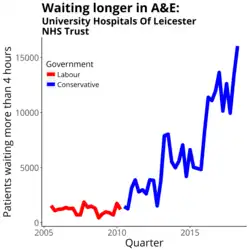 In January 2018 18% of patients needing admission from A&E had to wait more than four hours for a bed - an improvement in the Trust's performance against other NHS hospitals compared with previous years.[12] In November 2018 it was reported that the trust was having severe problems running the Intensive Care Unit at Leicester General Hospital because of problems with staff recruitment and retention. It proposed to move the unit to an 11 bed extension at Glenfield Hospital and open a six bed ICU annex at Leicester Royal Infirmary.[13]