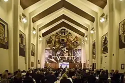 Rostrum end of the Great Hall, showing artworks by Leonard French (Regeneration, 1972) and some from The Journey series (1974).