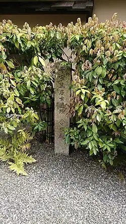 Stile beside the Kabutomon gate to the historical Urasenke estate, marking this as the site of Sen Sōtan's Konnichian