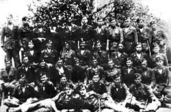 The Ustaše militia was created on 11 April 1941 when Marshal Slavko Kvaternik appointed a separate staff to control the various volunteer armed groups that had risen spontaneously throughout the NDH as the Yugoslav Army collapsed in the face of the Axis invasion. On 10 May 1941, Ante Pavelić issued a special order which detailed its formal organisation.[1] However, some of the groups that formed early were irregular or "wild" Ustaše units that were not included in the formal organisation, which initially numbered 4,500. The number of irregular Ustaše across the NDH was reportedly as high as 25,000–30,000.[2] Both formal and irregular units were soon involved in atrocities against Serbs, Jews, Gypsies, and all alleged and actual opponents of the Ustaše regime.[3]