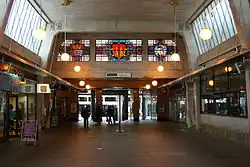 The forecourt of the new station was originally laid out to provide a turning circle for trolleybuses, which replaced trams in 1936. Ticket barriers are in operation.