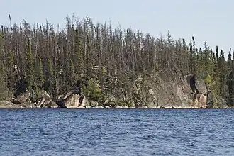Uyenanao Lake is a glacial lake on the Mistik Creek chain, approximately 20 kilometres (12 mi) northeast of Bakers Narrows. It is part of the Nelson River watershed, in the Hudson Bay drainage basin in the Northern Region of Manitoba, Canada. The surrounding mixed deciduous and coniferous forest is part of the Churchill River Upland portion of the Midwestern Canadian Shield forests.[1] The region around the lake consists of rocky parallel ridges with poorly drained areas of muskeg and irregular stony shorelines due to intense glaciation.[2] The lake is situated on the well known "Mistik Creek Loop", a remote canoe route 80 kilometres (50 mi) in length which can be paddled in four days.[3][4]
