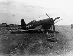 Marine Fighting Squadron 314 (VMF-314) was commissioned on October 1, 1943, at Marine Corps Air Station Cherry Point, North Carolina.[1] The squadron was originally given the nickname of, "Bob's Cats".[2] The squadron was assigned to Marine Aircraft Group 32 (MAG 32) flying the F4U Corsair and began training immediately for combat in the South Pacific. In February 1944, the squadron, along with VMF-324, was among the first units aboard Marine Corps Auxiliary Air Field Kinston.[3] The squadron departed MCAAF Kinston for the Pacific theater and arrived at Marine Corps Air Station Ewa on June 18, 1944, and was reassigned to Marine Aircraft Group 23, 3rd MAW.[4] From there it deployed to Midway Atoll. VMF-314 returned to MCAS Ewa in December 1944 and remained there until April 1945. In May 1945 the squadron moved to Ie Shima to take part in the Battle of Okinawa[4] as part of Marine Aircraft Group 22 (MAG-22).[5] During the campaign, VMF-314 pilots were credited with 11 kills[6] and the squadron was awarded the Presidential Unit Citation.[7] After the surrender of Japan, VMF-314 moved to Kyūshū, Japan as part of the occupation force. VMF-314 returned to Marine Corps Air Station El Toro in November 1945 and in March 1946 they arrived back at MCAS Cherry Point. For a short time, the squadron was reassigned to Marine Aircraft Group 22 (MAG-22), 9th Marine Aircraft Wing but was later decommissioned on April 30, 1947.[2]