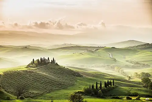 The Val d'Orcia or Valdorcia (Italian: [valˈdortʃa]) is a region of Tuscany, central Italy, which extends from the hills south of Siena to Monte Amiata. Its gentle, cultivated hills are occasionally broken by gullies and by towns and villages such as Pienza (rebuilt as an "ideal town" in the 15th century under the patronage of Pope Pius II),[1] Radicofani (home to the notorious brigand-hero Ghino di Tacco) and Montalcino (the Brunello di Montalcino is counted among the most prestigious of Italian wines).[2] Its landscape has been depicted in works of art from Renaissance painting to modern photography.