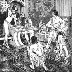 Interior illustration from Weird Tales (August–September 1936). It depicts Valeria standing on the far right, beside Conan. Art by Harold Saylor De Lay.