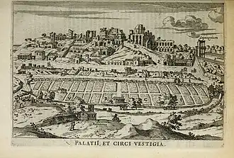 The Vallis Murcia lay between the Palatine (upper third) and Aventine hills, where the traces of the Circus Maximus are shown in this drawing from Roma Vetus ac Recens (1725) by the antiquarian Alessandro Donati