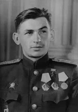 Following the outbreak of Operation Barbarossa in June 1941, he served in the 751st Separate Night Long-Range Bomber Regiment, which was tasked with striking at targets in the enemy's deep rear, while flying an Ilyushin Il-4 bomber. He became a member of the Communist Party of the Soviet Union in 1942.[2]
