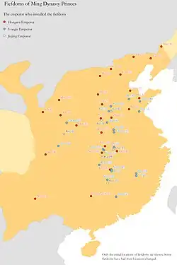 After Zhu Yuanzhang (Hongwu Emperor) founded the Ming dynasty, he designated his eldest son, Zhu Biao, as crown prince, and enfeoffed all of his other sons and a grandnephew as vassal princes. Fiefs of nine of these princes were located at frontier regions for defense. Hongwu Emperor also posthumously bestowed his late patrilineal and matrilineal relatives with princely titles.