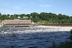 The Veazie Dam was a hydroelectric dam on the Penobscot River between Veazie and Eddington in Penobscot County, Maine. In 2010 the Penobscot River Restoration Trust bought the dam from PPL Corporation based on an agreement that was signed in 2004. Deconstruction of the dam began on July 22, 2013[2] as a part of an extensive project involving four dams to restore eleven species of sea-run fish to the Penobscot River.[3] The Veazie Dam was the furthest downstream of the dams on the Penobscot River; now the Milford and Orono Dam dams are furthest downstream, albeit on separate side of Marsh Island. The Great Works Dam, which was 8 mi (13 km) upstream of the Veazie Dam, was removed in 2012.[4][5][6][7]