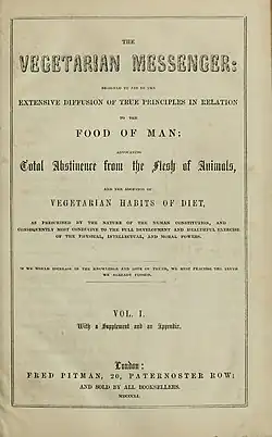 In 1849, London's vegetarians gathered and resolved to enhance the spread of vegetarianism in the capital. Consequently, in September 1849, they launched The Vegetarian Messenger, a journal that distributed almost 5,000 copies monthly at a cost of one penny each.[15] The society made available publications on the topic sometimes accompanied by lectures.[18]