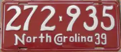 1939 | Embossed silver serial on maroon plate; "North Carolina 39" centered at bottom | none | 123-456 | 200-001 to approximately 686-000 | |