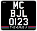 Rear Plate: 27x20 cm Black on yellow Bottom strip in Gambian Flag Text in the center bottom, saying The Gambia |