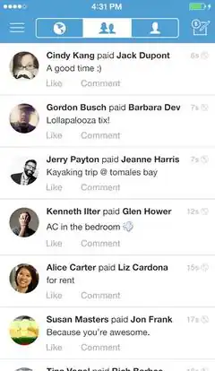 Venmo publishes a "world wide" public feed, a "friends only" feed, and a personal feed. By default, all Venmo transactions are shared publicly. Anyone who opens the app to the public feed, including those who do not use Venmo, can see these publicly shared transactions.[34] The user can make transactions private, but most users keep the default privacy settings.[35] Venmo encourages social interaction on the application through comments[36] using jokes, emojis, or likes.